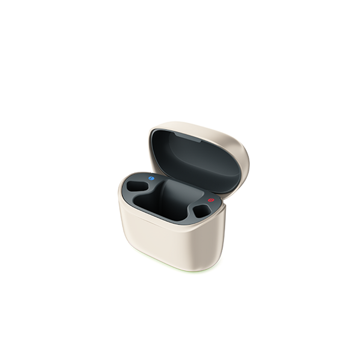 O carregador permite que você carregue seus aparelhos auditivos completamente em 3 horas, garantindo 24 horas de funcionamento.